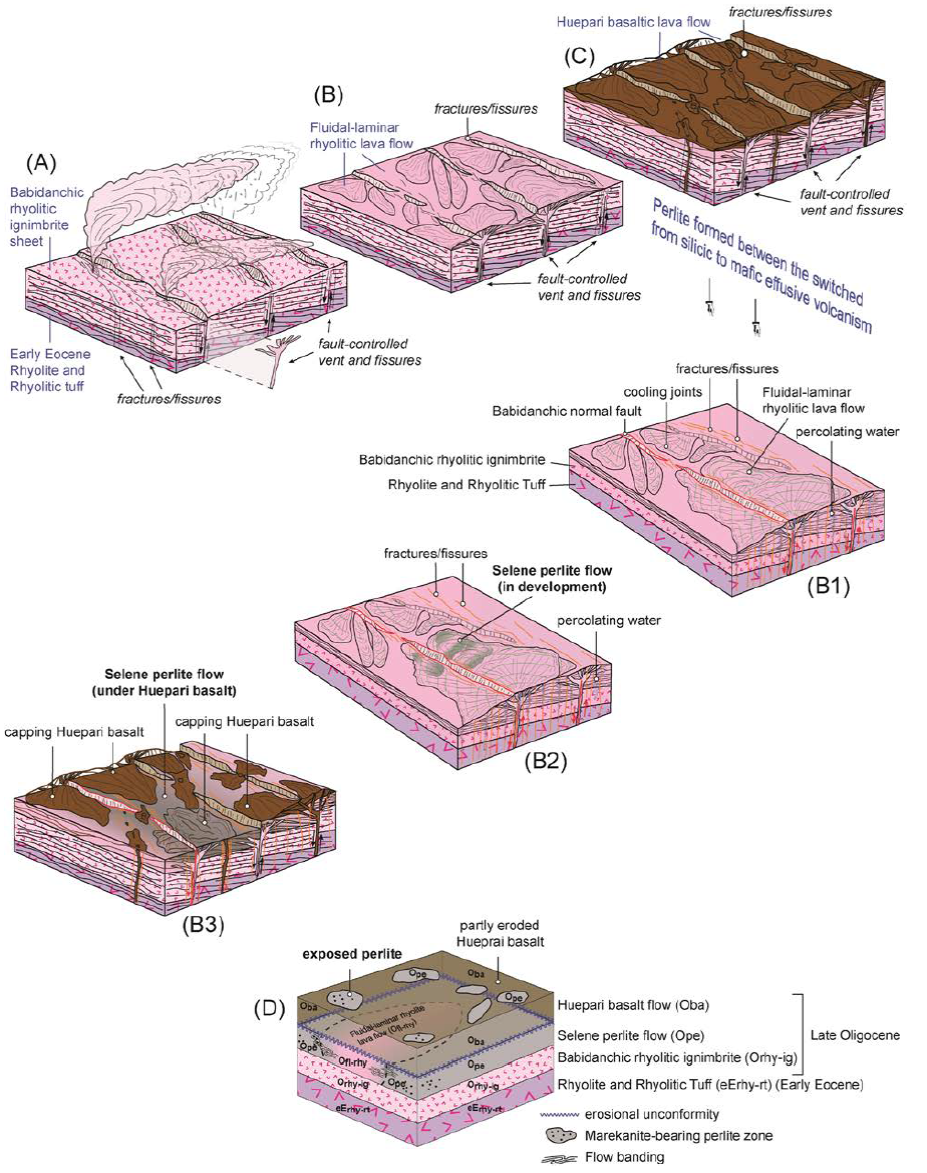 The rhyolitic and basaltic lithofacies of the Selene perlite prospect occur in the southern tip of the SET, which has been stretched by NW- and NS-trending normal faults linked to the Mexican BREP (Castro et al., 2010; Villalobos-Escobar and Castro, 2015) since the Late Oligocene (ca. 28 m.y.) (Gans, 1997). The NS-trending Babidanchic and Selene normal faults line up with nearby NS-trending active normal faults (Figures 1 B-D and 2). We suggest that the formation, preservation, and exposure of the Selene perlite deposit (and probably other perlite deposits in the region) were influenced by the pervasive normal faulting across the region. The tectonic history and seismic activity led to the formation of faults and fractures/fissures across the region. First, normal faulting and related fractures/fissures controlled the location of silicic volcanism and later waning mafic volcanism, as documented in other regions of the SMO (Bryan et al., 2013; Murray et al., 2013; Duque-Trujillo et al., 2014a, 2014b; Murray et al., 2015; Murray and Busby, 2015). These structural discontinuities promoted pathways that channelized both rising magmas and gases of effusive rhyolitic domes and lava flows and later basaltic lavas (proximal and vent volcanic facies) as well as percolating meteoric waters. The interactions between rapidly cooling rhyolitic lava flows with circulating near-surface or underground water led to the hydration of rhyolitic lava flows (i.e. , the flow-banded rhyolitic lava flow), obsidian, and large amounts of perlite prior to the eruption of the capping Huepari basalt directly on the Selene perlite. Yet, hydration of the rhyolitic rocks may have continued after the eruption of the Huepari basalt. Second, the Huepari basalt preserved the Selene perlite flow from later devitrification and total erosion because it sealed it. Third, regional crustal thinning, but in particular normal faulting along both the Babidanchic and Selene normal faults, was responsible for the uplift, subsequent partial erosion, and exposure of the Selene perlite flow (and overburden) to its present topographic conditions (favoring open-pit mining operations). Figures 17 B1-B3 illustrate schematically the progressive development of the Selene perlite ore deposit prior to the eruption of the overlying Huepari basalt. Figure 17D depicts the interpreted volcano-stratigraphic and morphologic situation of the Selene perlite flow based upon the available geologic data.