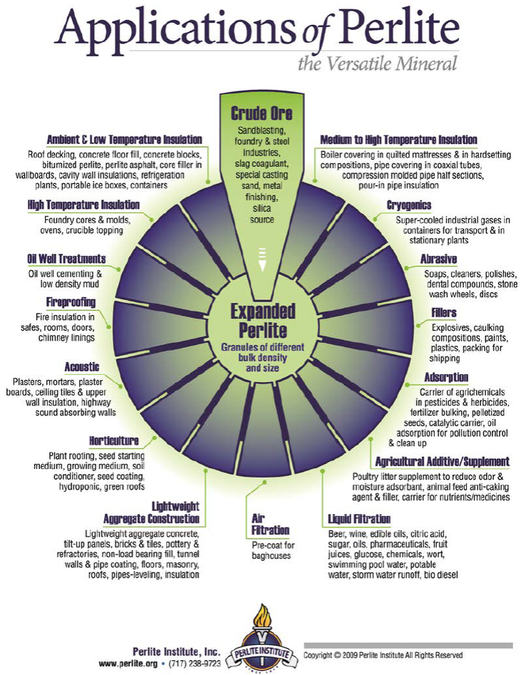 Crude perlite ore can expand ("pop") by a factor of 4 - 20 when rapidly heated to a suitable point (typically 760 - 1200 °C) in an industrial expansion furnace to create a product referred to as expanded perlite (Doğan and Alkan, 2004; Ennis, 2011; Perlite Institute). Expanded perlite has various physical properties with commercial applications including high porosity, low thermal conductivity, low bulk density, high sound absorption, high heat resistance, high surface area, and chemical inertness or stability. These properties make expanded perlite adaptable to applications in several industries including construction (Topçu and Işikdağ, 2007, 2008; Zukowski and Haese, 2010; Sengul et al., 2011; Celik et al., 2014), chemical (Vaou and Panias, 2010), air (Gutarowska et al., 2014) and liquid filtration (Chakir et al., 2002; Torab-Mostaedi et al., 2011; Akkaya, 2012), horticultural (Daza et al., 2000; Acuña et al., 2013; Asaduzzaman et al. , 2013), and petrochemical (Perlite Institute). The specific uses of expanded perlite in several industries are shown in Figure S1 in the Supplementary Figures section.