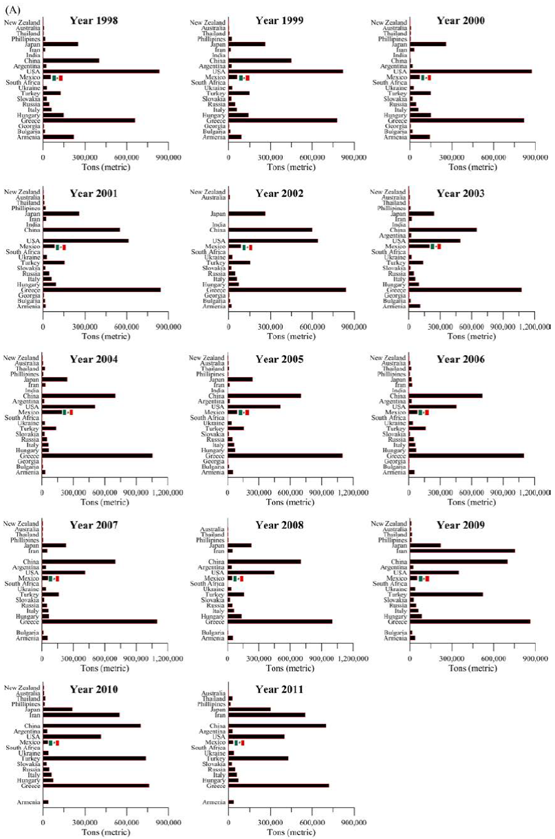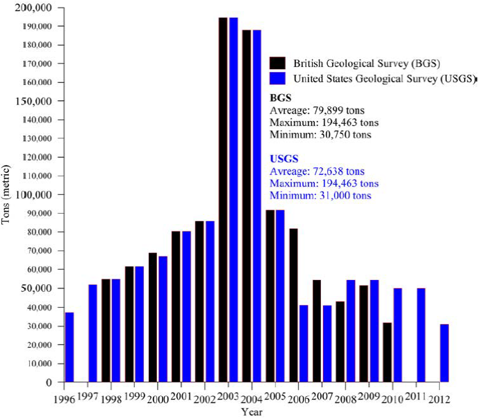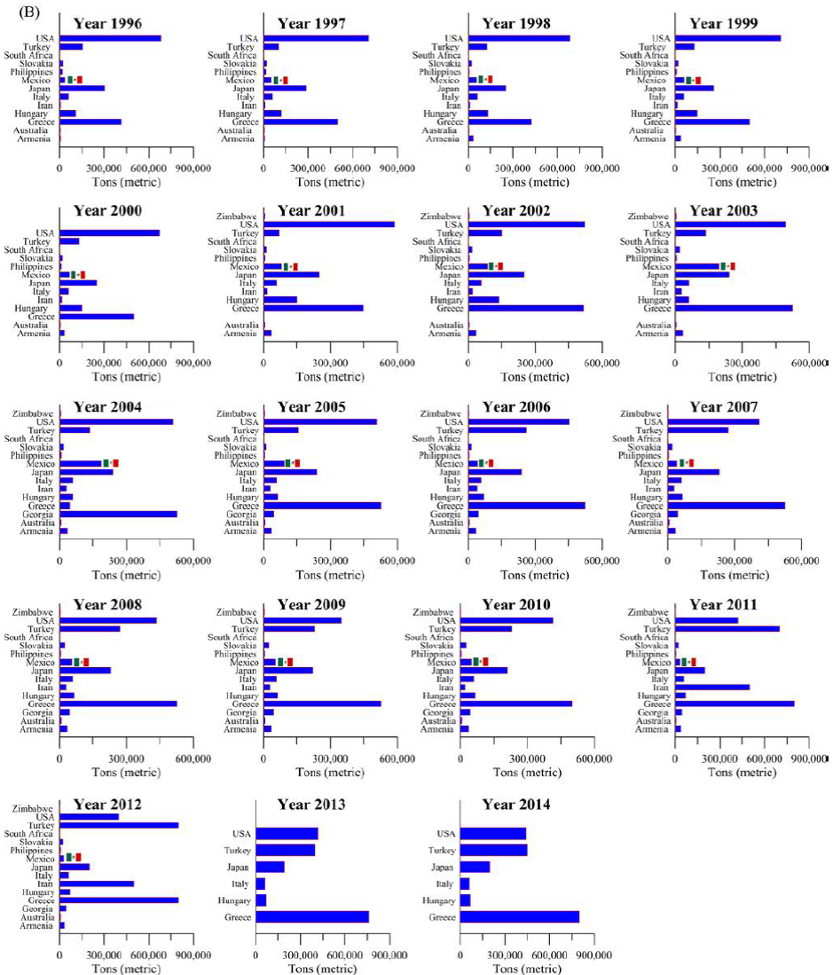 The economic value, distribution, and surface extent of perlite ore deposits in the western North American Cordillera north of the US-Mexican border are well-documented, particularly in the states of Texas, New Mexico, Arizona, Colorado, Wyoming, Utah, Nevada, California, Oregon, and Washington (Huntting, 1949; Jaster, 1956; Zielinski, 1978; Wilson and Emmons, 1985), as well as in British Columbia, Canada (Rotella and Simandl, 2004). Conversely, Mexican perlite ore deposits immediately south of the border remain both geologically understudied and poorly understood despite their widespread occurrences within the silicic volcanic units of the Sierra Madre Occidental (SMO) silicic large igneous province. Nonetheless, Mexico has steadily produced perlite for nearly two decades (see Figure S2 in the Supplementary Figures section), although in low quantities relative to major world perlite producers such as Greece, China, Iran, Turkey, USA, Japan, Hungary, Italy, Russia, and the Ukraine, according to statistical data published by the British Geological Survey (BGS, 2004, 2007, 2010), Bide et al.(2014) at the BGS, the U.S. Geological Survey (USGS, 2005) and Bolen (2000, 2011a, 2011b, 2014, 2015) at the USGS. Perlite production in Mexico has been highly variable: it grew steadily from 1996 to 2002, boomed in 2003 and 2004 (reaching almost 200000 tons in both years), dropped in 2005, and has since plateaued (see Figure S3 in the Supplementary Figures section). Yet Mexico remains the largest and second largest perlite producer in Latin America and North America, respectively, according to the aforementioned statistics.
