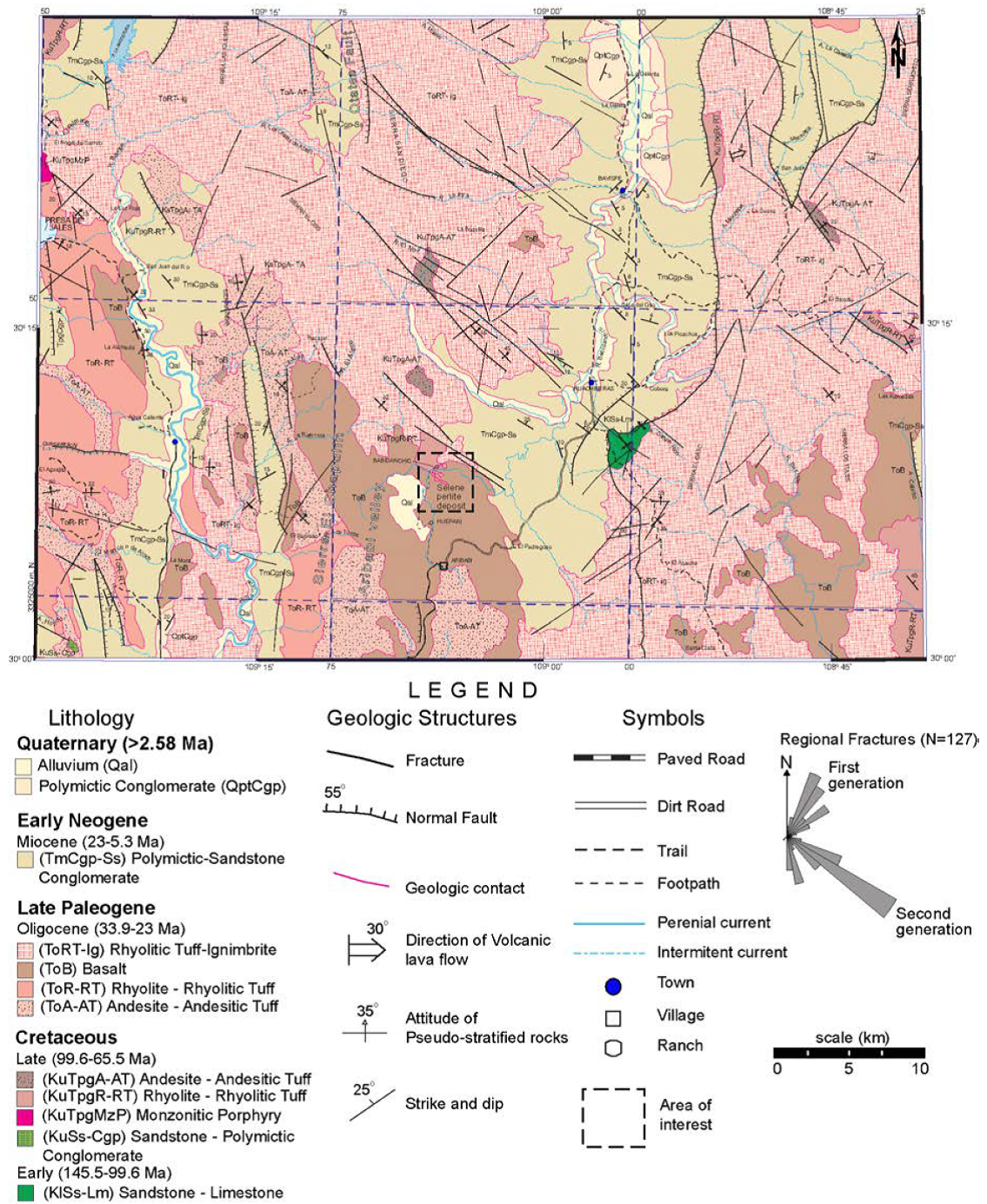 The main geologic structures around the Selene perlite prospect are 5 to 60 km-long, N-S and NW-SE normal faults and associated 2 to 16 km-long, NW-SE fractures/fissures that affect Late Oligocene rhyolitic lava flows and rhyolitic ignimbrites (Figure 6) and are linked to the Mexican BREP (Palafox-Reyes et al., 1998). Various north-south, west-dipping normal faults bound long, narrow half-graben basins filled by polymictic conglomerates and lesser sandstones of Miocene age (Figures 1 A-D and 2). The Selene perlite prospect is bounded to the west by a valley, in turn bounded by an uplifted Late Oligocene volcanic ridge comprised of andesitic lavas and tuffs, and subordinate rhyolitic lavas (Palafox-Reyes et al. , 1998) named the Sierra El Chapulín (Figures 3 A-B) in the topographic chart of the Instituto Nacional de Estadística y Geografía (INEGI, 2005). It is bounded to the east by a ~ 120 km-long by ~ 13 km-wide, N-S trending (synextensional?) half-graben that wraps around the eastern slopes of the SET (Figures 1, 2 and 3 A-B). The NNW-SSE-trending Sierra El Chapulín is 11 × 5 km, and is bounded to the west by a ~ 27 km- long by ~ 2.5 km- wide N-S-trending sedimentary basin. All the active and inactive normal faults around the Selene perlite prospect are linked to the Mexican BREP (Palafox-Reyes et al. , 1998; Suter, 2008a, 2008b; Castro et al., 2010; Rascón-Heimpel et al., 2012; Villalobos-Escobar and Castro, 2015; Suter, 2015) and controlled the synextensional deposition of Miocene volcaniclastic units and Quaternary alluvium across the area. Recent seismological monitoring around the SET shows rather low levels of seismicity within and around the Selene perlite prospect compared to levels of seismicity beyond the prospect scale (Castro et al. , 2010; Villalobos-Escobar and Castro, 2015). These seismological studies reveal three north-south-striking, steeply west-dipping, seismically active normal faults within ~ 25 to 100 km north of the Selene perlite prospect, and two coplanar faults farther south (~ 25 to 45 km) (Castro et al. , 2010; Villalobos-Escobar and Castro, 2015) (Figures 3 B-C). The northern normal faults (from closest to farthest) correspond to the active Otates (~ 28 km- long), Teras (~ 21 km- long), and Pitáycachi (~ 42 km- long) faults (Castro et al. , 2010; Villalobos-Escobar and Castro, 2015) that ruptured during the 3 May 1887 M w 7.5 earthquake (Suter, 2001, 2006, 2008a, 2008b, 2015; Suter and Contreras, 2002). The southern faults are the active Villa Hidalgo and Granados normal faults of comparable length (Castro et al. , 2010; Villalobos-Escobar and Castro, 2015). Hence, the Selene perlite ore deposit clearly formed in a volcanogenic setting that has undergone crustal extension since the Late Paleogene. This implicates permeability in the uppermost crust.