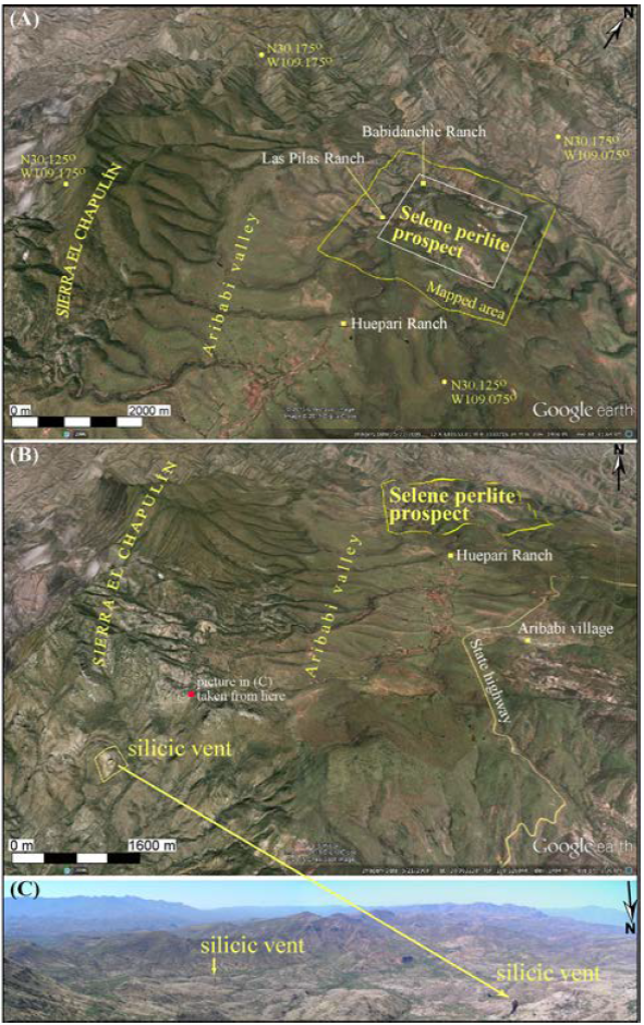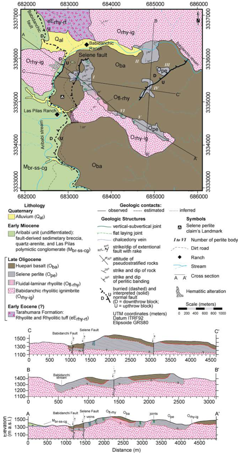 The State of Sonora, Mexico holds several poorly geologically understood and under-studied volcanogenic-related perlite ore deposits, of which probable reserves and expansion indexes remain known only on a preliminary basis. Many of these perlite ore deposits exist in tectonically extended areas traversing from coastal to eastern Sonora. Our geologic mapping of the Selene perlite ore deposit, formerly Babidanchic perlite, covers an area of 16 km2and documents four additional mappable perlite outcrops proximal to the already known ones. Therefore, the amount of potential perlite reserves in the Selene perlite prospect has increased significantly; however, a formal estimation of the reserves is expected. The flow-banded rhyolitic lava flow of inferred Late Oligocene age is the only silicic unit that hosts perlites. The (Selene) perlite dome-coulee formed prior to the eruption of the capping Huepari basalt, which was deposited along an erosional unconformity. In general, all the mapped perlite bodies occur near normal faults and related fractures/fissures, the surface expressions of which are now tributary streams, gullies, and rivers. Normal faulting in the region, including the Babidanchic and Selene normal faults, linked to the Mexican BREP, strongly influenced the formation, preservation, and exposure of the Selene perlite flow. In addition to promoting volcanic fissure vent silicic and mafic magmatism across the region, these structural discontinuities increased the permeability of the subsurface, and channeled percolating meteoric waters and rising gases through a network of interconnected fissures. The water-lava interactions led to the hydration of the flow-banded rhyolitic lava flow and later formation of huge amounts of perlite. The Selene perlite flow was partly preserved by the capping Huepari basalt, but continued normal faulting and subsequent erosion exposed it to its present topographic conditions. Normal faulting across the region also developed the Aribabi half-graben, filled by the Early Miocene volcaniclastic Aribabi unit. Deposition of the Aribabi unit sharply marks the end of Late Oligocene bimodal volcanism and the onset of (synextensional?) terrigenous clastic deposition in a NS-oriented structural basin, at least across the Selene perlite prospect region.