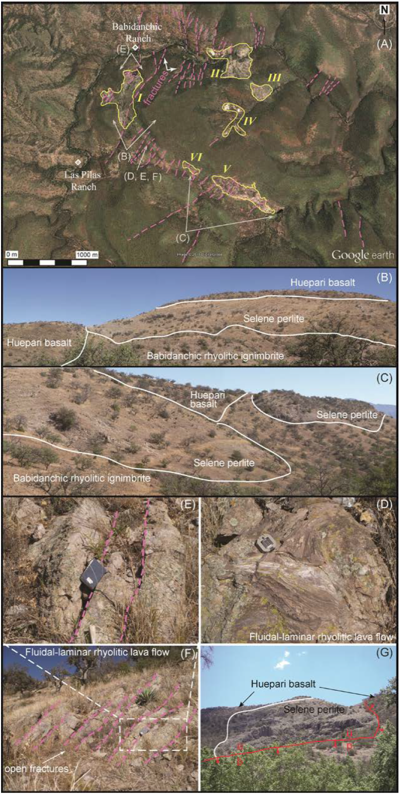The geologic evolution of the Selene perlite ore deposit is summarized as follows. The (i) Babidanchic rhyolitic ignimbrite sheet erupted during the Late Oligocene from a vent(s) located outside (10 - 20 km) the Selene perlite prospect. The vent(s) was controlled by pre-existing NS-trending, steeply dipping normal faults and fissures related to the Mexican BREP; followed by (ii) the eruption of the flow-banded rhyolitic lava flow and domes from a normal-fault-controlled vent(s) and its subsequent progressive hydration leading to the formation of marekanites, thin bands of obsidian, and huge amounts of (iii) perlite (i.e. , Selene perlite flow); (iv) eruption of the plagioclase-olivine-rich Huepari basalt also through pre-existing normal-fault-controlled vents and/or fissures towards the end of the Late Oligocene or beginning of the Miocene and its deposition over the underlying silicic volcanic units along an erosional unconformity. (v) Normal faulting of this Late Oligocene bimodal volcanic sequence along the NS-trending Babidanchic normal fault probably in the Early Miocene led to the subsequent uplift, partial exposure, and erosion of this bimodal volcanic sequence. This resulted in the formation of the adjacent Aribabi half-graben filled by the (vi) volcaniclastic Aribabi unit no earlier than the Early Miocene. Finally, a (vii) second, but smaller, normal faulting episode along the coplanar Selene normal fault in the post-Early Miocene that hosts syn- or postkinematic chalcedony and calcite veins.