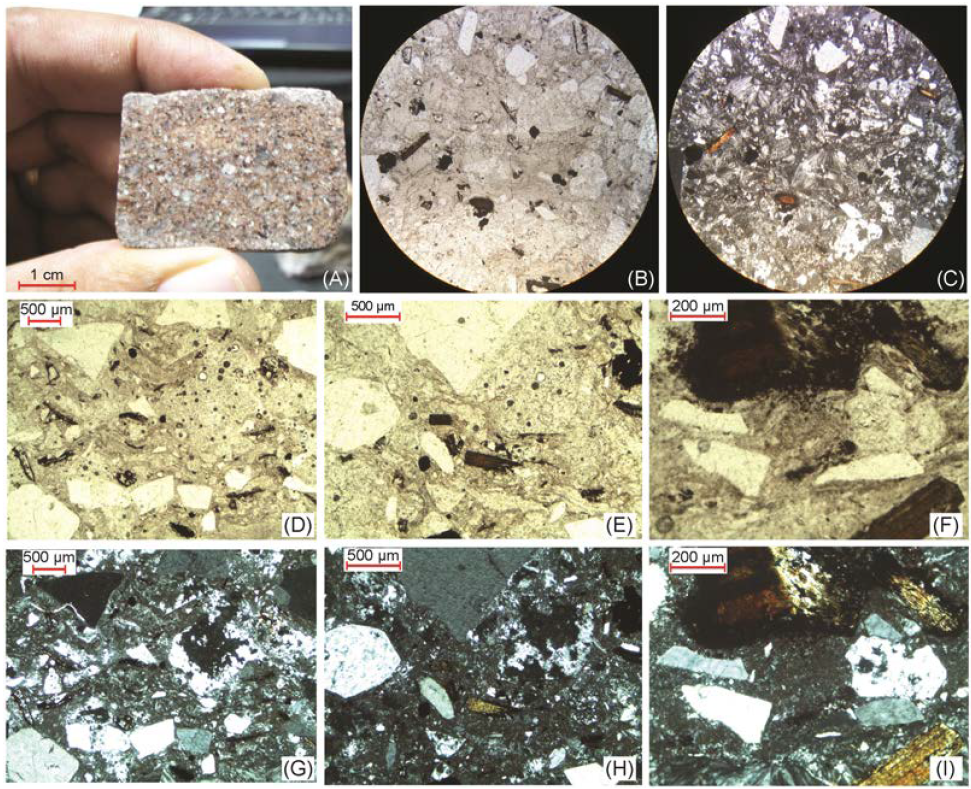 Figure 7 Petrography of the Babidanchic rhyolitic ignimbrite. Rock slice with a high concentration of crystals and lithic fragments in a devitrified glass matrix (A). Photomicrograph taken with a 2.5× total power and natural light showing the phenocrysts of quartz, feldspar, plagioclase, biotite and Fe-Ti oxides (B). Same view as B in crossed nicols (C). Phenocrysts of alkali feldspar, plagioclase, quartz, and biotite in a vitric matrix; natural light (D). Pumice fiammes in a eutaxitic matrix; natural light (E). Feldspar fragment with sieve texture and biotite micro-phenocrysts (F). (G), (H) and (I) have the same view as D, E and F, respectively, but with crossed nicols.