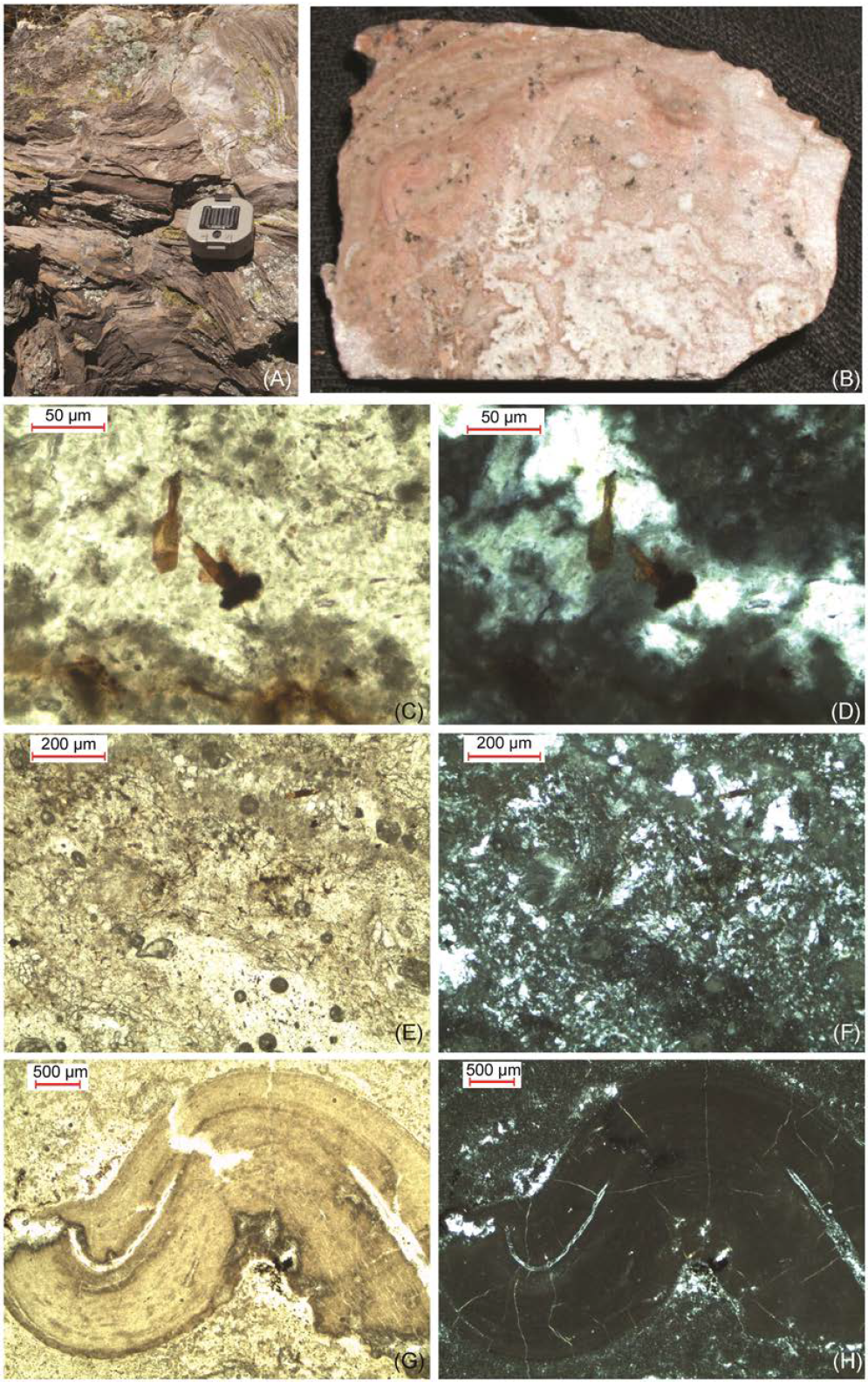 Figure 8 Field photograph of outcrop (A), 3 × 5 cm hand sample (B) and petrographic photographs of the flow-banded rhyolitic lava flow (C-H). Microcrystalline matrix interlayered with a contorted flow banded obsidian (G and H). Thin sections showing porphyritic texture comprising fine, sparse, euhedral phenocrysts of feldspar, quarts and biotite in a microcrystalline groundmass of the same mineral composition (C, E, G polarized light and D, F, H crossed nicols).