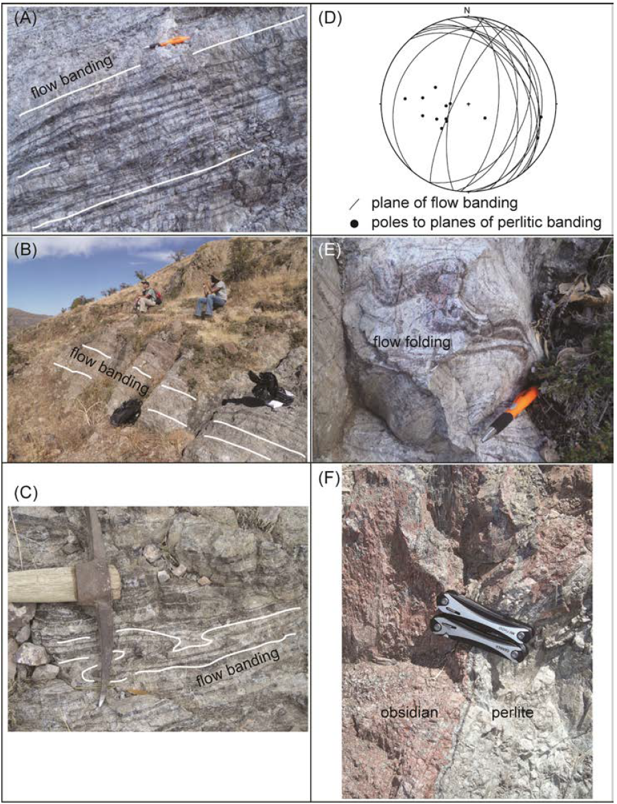 Figure 9 Representative filed photographs of perlitic banding (A-C), structural data of perlitic banding plotted in stereonet of equal-area lower-hemisphere projection (D), and perlitic flow-folding (E). Perlitic banding dips gently- to- moderately toward the east (D). Perlitic banding and perlitic flow-folding are defined by intercalations of perlite and black- or- red obsidian. Thick band of red obsidian in perlite (F).