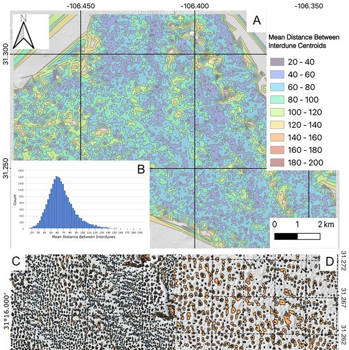Figure 3 A) Map of interdune spacings from centroids of interdunes identified in local relief model in QGIS. Distances are the means of the four nearest interdune centroids to each point. Note that interdune spacings increase from west to east and dunes are more widely spaced on the tops of relict transverse ridges. B) Histogram of mean spacings for the 26,790 identified interdunes within the dune field. This includes interdunes between both north-south and east-west-trending dunes, average is 76.5 m and standard deviation is 23 m. The distance is calculated from the mean of the distances to the nearest 4 interdune centroids from the centroid of each interdune. C) Shows a representative sample of interdunes identified in the local relief model, superimposed on the shaded relief model from the 5 m resolution DEM (INEGI, 2022). D) Is a representative detail from the central dune field of the identified interdunes and hillshade map, showing the correspondence. The points are the centroids of the interdunes.