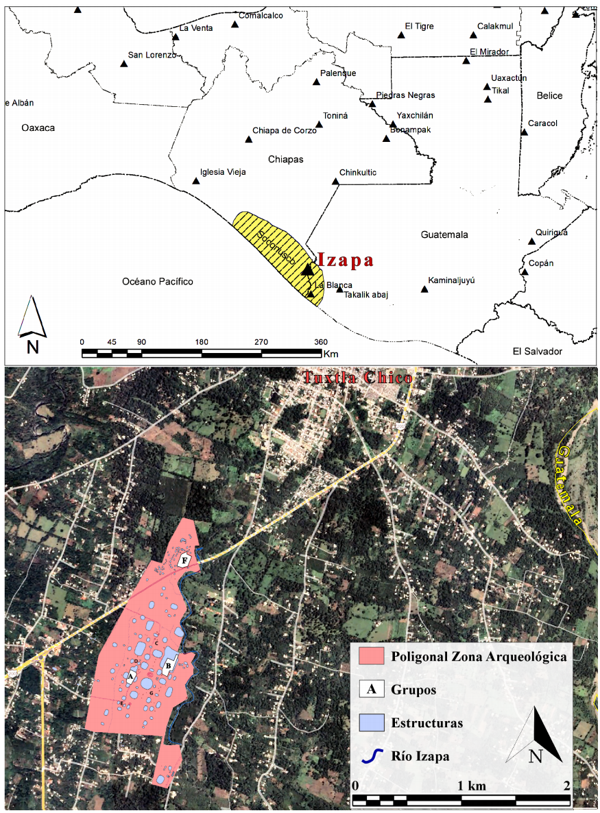 La zona arqueológica de Izapa se encuentra en el piedemonte aledaño a la costa del Pacífico chiapaneco, dentro del actual municipio de Tuxtla Chico (Figura 1). Este sitio se estableció como centro rector o asentamiento de primer rango de la región del Soconusco, con actividades cívicas y rituales y un diseño urbano complejo con estructuras arquitectónicas monumentales organizadas en torno a amplias plazas de planta rectangular (Lowe et al., 1982). Se estima que el asentamiento prehispánico se extendió sobre un área aproximada de 200 ha (Rosenswig et al., 2013), aunque solo 127 ha se encuentran incorporadas dentro de la zona arqueológica establecida en 2002, la cual incluye a los principales grupos arquitectónicos (Grupos A a la H). De estos grupos, solo tres (A, B y F) se encuentran parcialmente protegidos por el Instituto Nacional de Antropología e Historia (INAH) y abiertos al público; el resto se encuentra al interior de predios de propiedad privada (Uriarte y Pérez, 2018).
