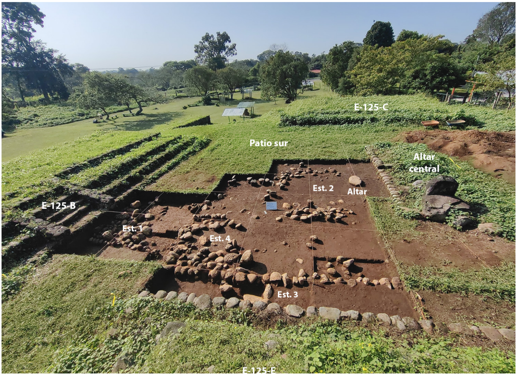 Figura 10 Vista desde el norte del área excavada en el patio sur del conjunto de la Estructura 125-B mostrando los rasgos arquitectónicos reconocidos.