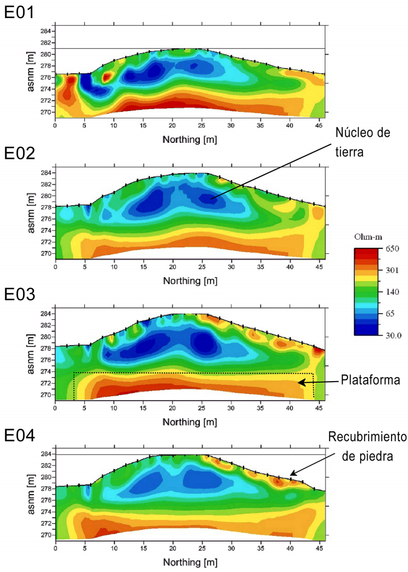 El equipo utilizado fue un resistivímetro Syscal Jr manufacturado por IRIS Instruments (Orleans, Francia) con 24 electrodos de acero de 30 cm de longitud y – pulgadas de diámetro. Este equipo funcionó con una batería externa de 12V, utilizando cables multi-core para el control de electrodos conectados en una o dos líneas. El sistema está diseñado para realizar automáticamente conjuntos predefinidos de mediciones de resistividad con capacidad de despliegue longitudinal. Los arreglos electródicos aplicados fueron Wenner-Schlumberger y Dipolo-Dipolo, que fueron elegidos por su alta sensibilidad a los cambios horizontales en la resistividad y porque presentan una alta relación señal/ruido (Loke, 2002). El programa utilizado para el procesamiento de los datos fue EarthImager 2D y 3D (© 1999 Advanced Geosciences, Inc), utilizando la técnica de mínimos cuadrados con inversión suavizada con restricciones para producir un modelo del subsuelo a partir de los datos de resistividad. En el caso de los perfiles levantados en la pirámide principal, los puntos fueron corregidos por topografía.