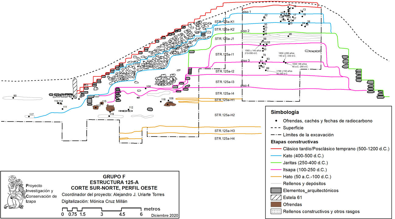 Las primeras intervenciones arqueológicas en el Grupo F fueron realizadas por la Fundación Arqueológica del Nuevo Mundo (New World Archaeological Foundation, NWAF), grupo de investigación arqueológica de la Universidad Brigham Young dedicado al estudio de los orígenes y desarrollo de las sociedades complejas en el nuevo mundo. Así, entre 1963 y 1965, el Grupo F fue explorado intensivamente y se restauraron parcialmente algunas estructuras (Lowe et al, 1982). Sobresale la intervención en el basamento de la Estructura 125-A (Figura 3), donde se realizaron pozos y calas que se adentraron hasta una profundidad de 10.5 m dentro del núcleo del edificio, aunque sin llegar al estrato estéril, identificando una compleja secuencia constructiva de 12 etapas que, en conjunto con las ofrendas cerámicas recuperadas y las fechas de radiocarbono obtenidas de los restos óseos analizados, permitieron establecer las bases de la cronología conocida hasta el momento para los periodos Clásico y Postclásico en Izapa (Lowe et al., 1982; Lee, 1973). Sin embargo, a pesar de los alcances de las investigaciones de la NWAF, no existe suficiente información disponible o publicada sobre las distintas etapas constructivas de sus edificaciones, incluyendo sus características arquitectónicas, formales y cronológicas, a excepción de la Estructura 125-A.