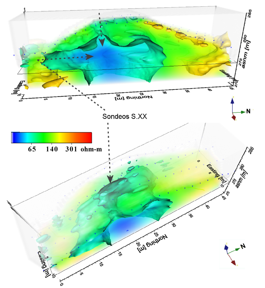 Figura 13 Volumen del montículo principal desplegado en iso-superficies de los valores de resistividad eléctrica. Las zonas de calas excavadas en la década de 1960 están marcadas con flechas punteadas.
