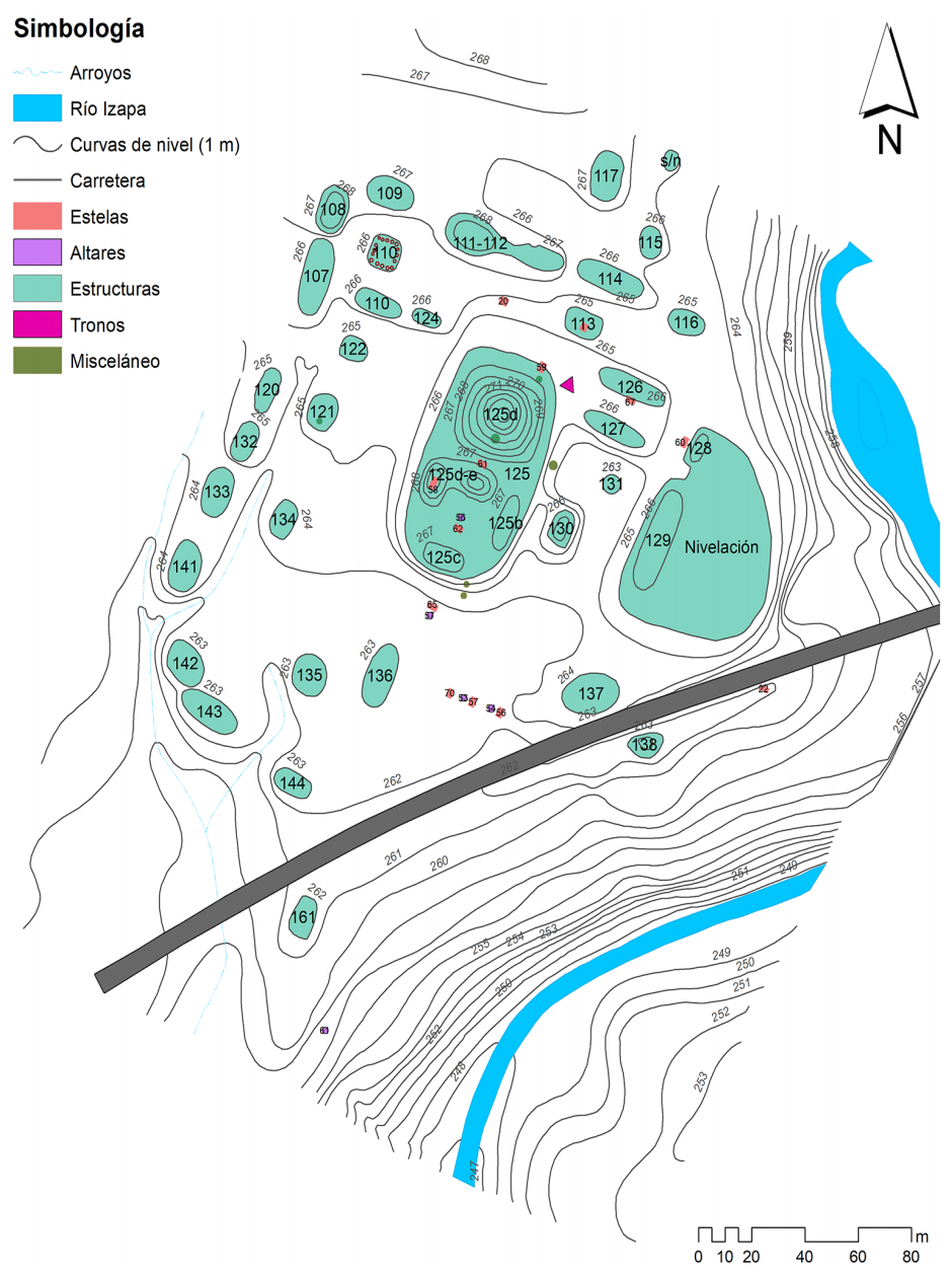 En este intervalo de tiempo, se definió un patrón arquitectónico que fue compartido por otros asentamientos de la región del Soconusco, el cual constaba de espacios rectangulares delimitados por plataformas de baja altura, dentro de los que se levantaban estructuras monumentales como basamentos escalonados y juegos de pelota (Rosenswig y Mendelsohn, 2016). En términos generales, la arquitectura del Grupo F (Figura 2) se caracterizó por el predominio del empleo de materiales constructivos térreos para la elaboración de rellenos, argamasas, pisos y acabados, así como de cantos rodados de rocas ígneas, principalmente tobas y basaltos sin labrar, para la construcción de muros de mampostería (Lowe et al., 1982). Por sus dimensiones y ubicación, puede afirmarse que la principal construcción del Grupo F fue la Estructura 125, un conjunto arquitectónico sobre una amplia plataforma de hasta 1.5 m de altura, conformado por seis estructuras organizadas en torno a dos patios, destacando la Estructura 125-A, un basamento de 7 m de alto (Lowe et al., 1982); la localización de enterramientos humanos asociados a los edificios de este conjunto acompañados de ofrendas suntuarias con artefactos procedentes de regiones tan distantes entre sí, como Teotihuacán y las Tierras Bajas Mayas (Lowe et al., 1982; Clark y Lee, 2018), subrayan su importancia para los grupos de élite de Izapa durante sus fases tardías de ocupación.