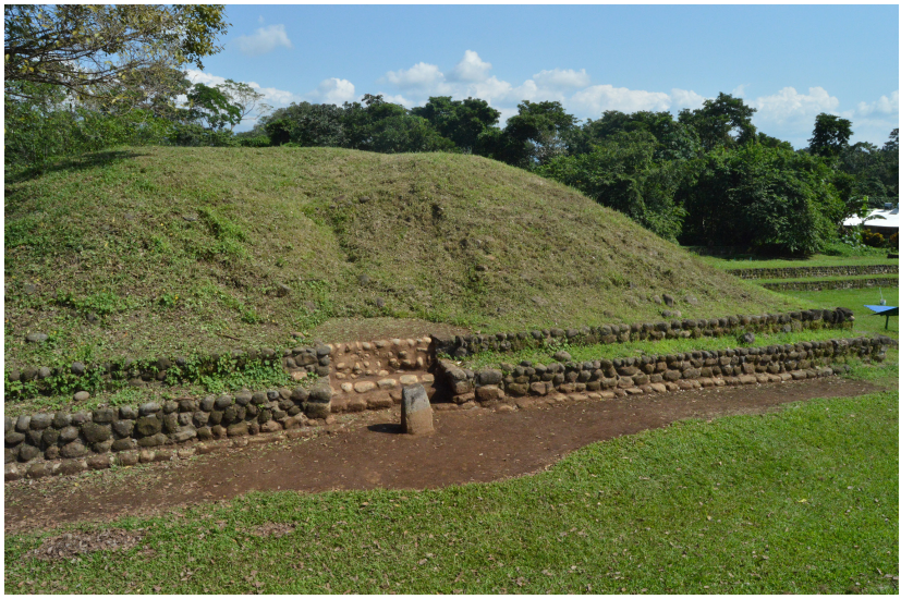 Figura 3 Fachada sur de la Estructura 125-A. Obsérvese la depresión en el área excavada por la NWAF (Lowe et al., 1982) ocasionada por el hundimiento de los materiales de relleno no compactados.