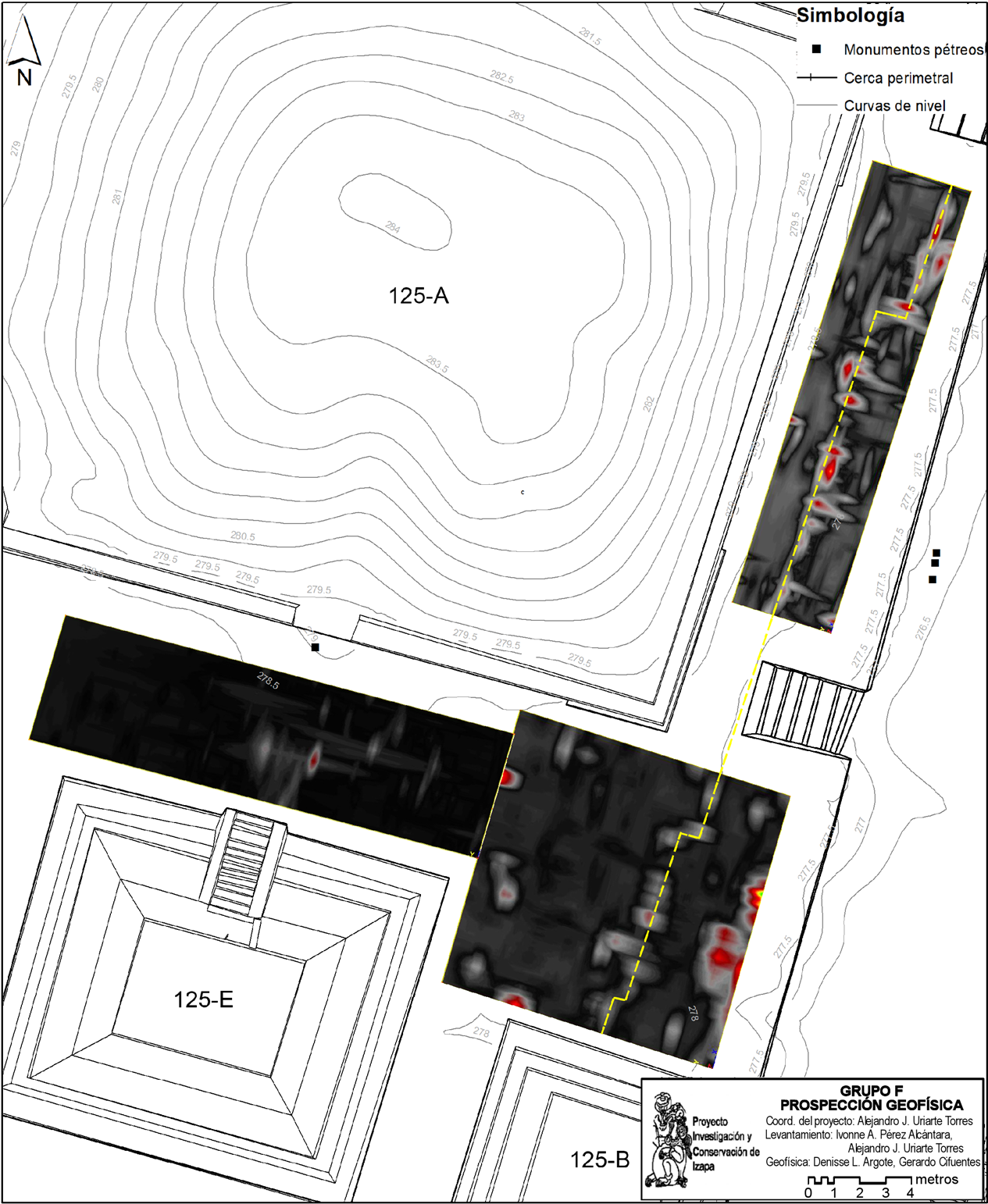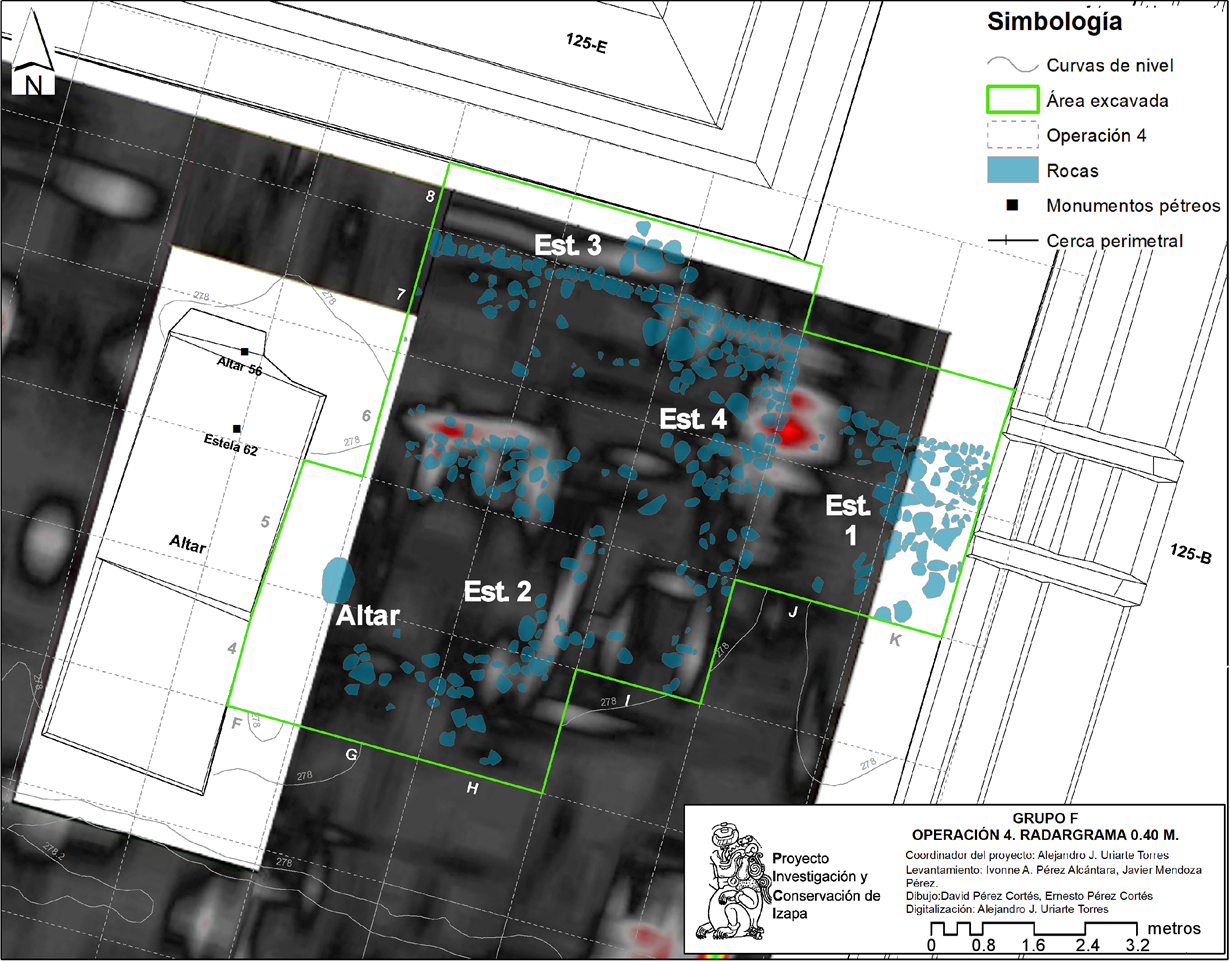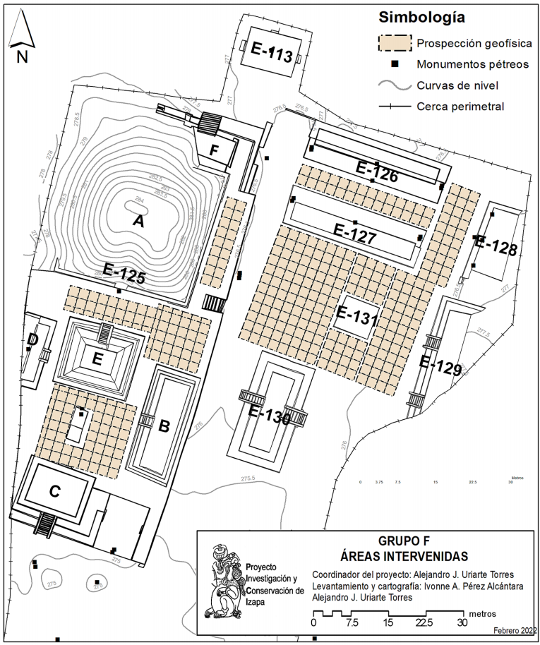Es por ello que, como parte de los trabajos arqueológicos del Proyecto Arqueológico Investigación y Conservación de Izapa del INAH que se desarrolla en la zona desde 2015, se diseñó un estudio por medio de los métodos geofísicos de radar de penetración terrestre y tomografía de resistividad eléctrica, con el objetivo de detectar la presencia de rasgos en el subsuelo que contribuyan a la reconstrucción del proceso de desarrollo constructivo y de organización espacial del Grupo F. La caracterización de anomalías eléctricas y electromagnéticas proporcionaron información útil sobre la profundidad de estructuras bajo el subsuelo, su geometría y localización, lo que establecer áreas potenciales de excavación. La realización de pozos y calas estratigráficas en puntos indicados por los métodos geofísicos en el patio sur de la Estructura 125 permitieron revelar plataformas menores de etapas previas, perfilando una configuración arquitectónica diferente a la que actualmente se aprecia. Las exploraciones realizadas, así como futuras intervenciones, permitirán ir afinando el desarrollo constructivo y cronológico de las principales construcciones del Grupo F, aumentando nuestra comprensión sobre el desarrollo de Izapa posterior al apogeo Preclásico.