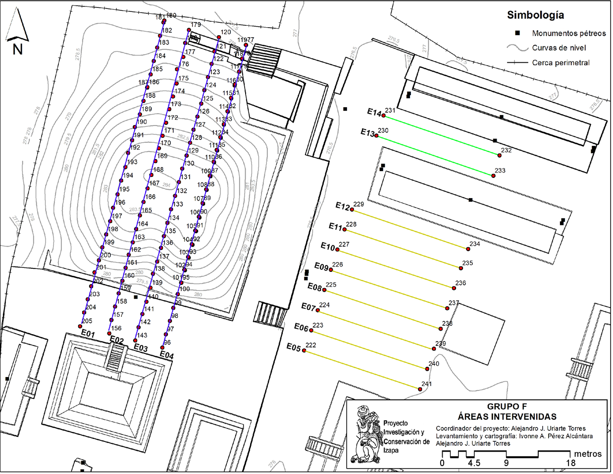 Para el caso de la zona arqueológica de Izapa, se levantaron un total de 14 líneas de medición en tres áreas del Grupo F (Figura 5). Los primeros 4 perfiles (E01 a E04) se ubicaron en el basamento mayor del sitio (Estructura 125-A). La separación entre perfiles fue de 4 m; cada línea contaba con 24 electrodos con una separación de 2 m entre cada electrodo, por lo que se alcanzaba una longitud de 46 m por cada línea. El objetivo específico de estos perfiles era determinar etapas constructivas de la pirámide. En esta estructura no se utilizó el georradar debido a que la agreste topografía local no permitió el paso del equipo. El segundo bloque de perfiles eléctricos se realizó en la plaza oriente (E05 a E12), colocando 8 líneas de 17.25 m de longitud cada una (24 electrodos separados a 0.75 m por línea) y con un espaciamiento entre líneas de 3 m (ver Figura 5, líneas amarillas). Los últimos dos perfiles (E13 y E14) se realizaron sobre la cancha del juego de pelota (ver Figura 5, líneas verdes). Al igual que el bloque anterior, estos perfiles medían 17.25 m de largo, con una separación de 3 m entre ambas líneas. Las coordenadas de inicio y final de las líneas del juego de pelota coincidían con las de los perfiles de la plaza.