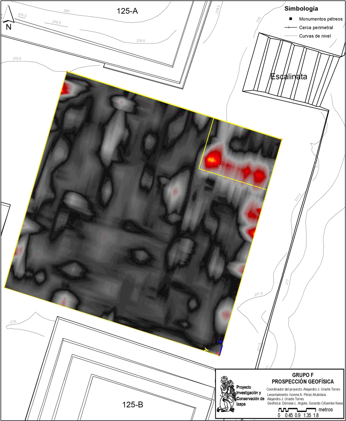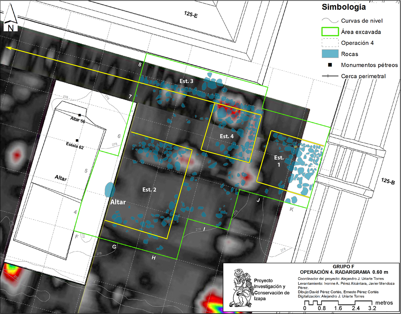 En el patio sur se obtuvieron una serie de anomalías con configuraciones geométricas bien definidas (lineales y rectangulares), principalmente en las porciones norte y este de la plaza (Figuras 8 y 9), lo que permitió establecer zonas potenciales para realizar excavaciones arqueológicas controladas (Figura 10). Para ello, se propuso un área de 67 m2 con el objetivo de esclarecer la naturaleza de las anomalías detectadas y, en caso de identificarse rasgos arquitectónicos, definir sus características y probable cronología. El patio sur (Figura 4) es un espacio abierto de aproximadamente 340 m2 que se encuentra delimitado al norte por la Estructura 125-E, un basamento escalonado de dos cuerpos y 3 m de altura, al oeste por la Estructura 125-D, que consta de una plataforma rectangular de dos cuerpos de 14.30 m de frente y 1.15 m de altura, al este por la Estructura 125-B y al sur por la Estructura 125-C, que son basamentos rectangulares de 22 m de frente y 1.30 m de altura. Al centro del patio se ubica un altar central, construcción con forma rectangular de 38 cm de altura que sirvió de soporte a la Estela 62 y al Altar 56.