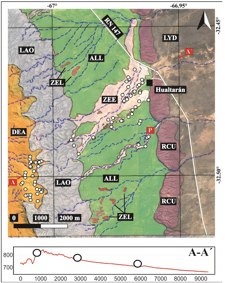 La diferencia altimétrica entre la superficie de los depósitos de abanicos aluviales (AAL) y los sectores donde estos han sido removilizados (ZEE) pueden ser de unos 6 m en los sectores proximales a la ladera serrana (LAO; Figura 3: perfil topográfico). Sin embargo, este grado de encajamiento no siempre es tan importante ni evidente.