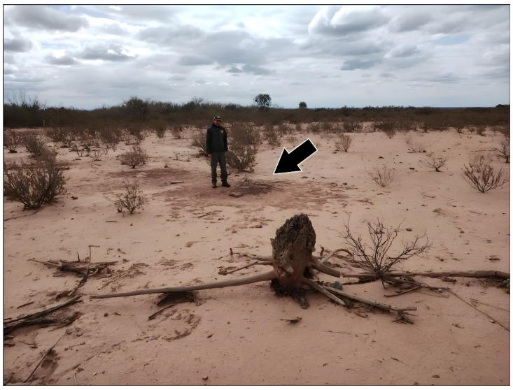 En la Figura 5 se observa a Daniel Figueroa (APN) parado al lado de un hornillo actualmente expuesto y perteneciente al sitio fechado en un milenio de antigüedad. En la parte frontal de la imagen hay un algarrobo hachado para la producción de carbón en tiempos históricos. La diferencia en el nivel es de más de 50 cm, mayormente consecuencia de la profundización de la cárcava -vegetada-, luego de que se realizara una intervención para mejorar un camino histórico que permitió el ingreso de vehículos para turistas.