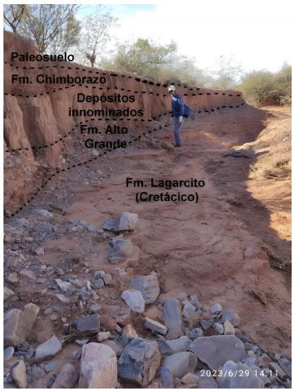 La erosión y removilización durante el Holoceno, tanto de los depósitos de abanicos aluviales como aquellos de la Fm. Lagarcito, cubrió con sedimentos las zonas previamente erosionadas en los depósitos aluviales. La secuencia estratigráfica de estos depósitos es visible en las barrancas de cárcavas y arroyos del faldeo oriental de las Serranías Occidentales de San Luis y que abarcan el espacio temporal del Pleistoceno tardío-Holoceno. En el arroyo sin nombre (Figura 2) se realizó un estudio sedimentológico y estratigráfico inicial, su objetivo fue relacionarlo con las secuencias conocidas a escala regional (Tabla 1).