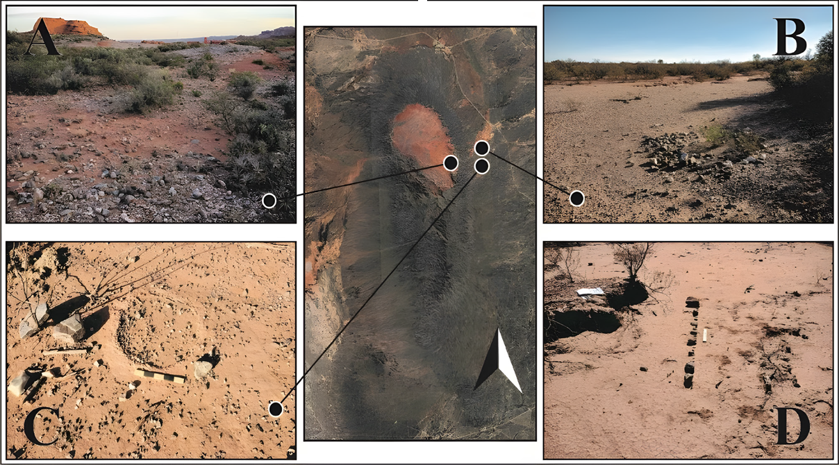 Figura 6 (A)Ejemplo de cantera arqueológica en el mirador del Potrero de la Aguada; (B) fogón de piedra aún estructurado en el límite en el sur del yacimiento Hualtarán 1; (C) Hornillo en el sitio El Cachilote 2; (D) Experimento 1 del estudio tafonómico en desarrollo.