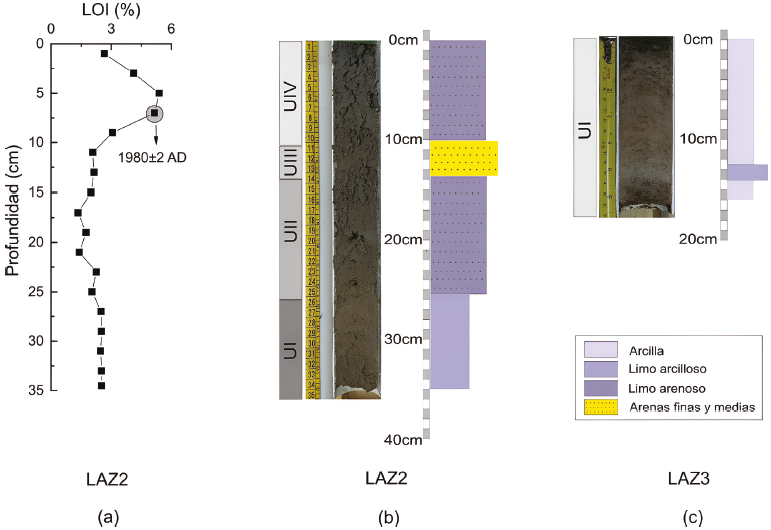 En el testigo LAZ2 (Figura 2b), la unidad I (UI) se extiende desde la base del testigo hasta los 25.5 cm. Está conformada mayoritariamente por limos arcillosos y los valores de LOI (Figura 2a) indican una baja proporción de materia orgánica. En la unidad II (UII), que se extiende desde una profundidad de 25.5 cm hasta los 13.5 cm, la textura del sedimento cambia y se observa un tamaño de grano predominantemente mayor y la presencia de limos arenosos.