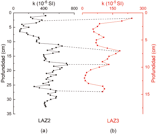 Figura 3 Registros de k en función de la profundidad para (a) LAZ2 y (b) LAZ3. Las líneas punteadas muestran los puntos de correlación entre los testigos.