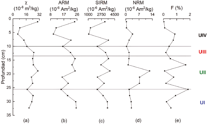 Figura 4 Registros de (a) χ, (b) ARM, (c) SIRM, (d) NRM y (e) F (%) en función de la profundidad para el testigo LAZ2. Las líneas negras indican los límites entre las diferentes unidades litológicas.