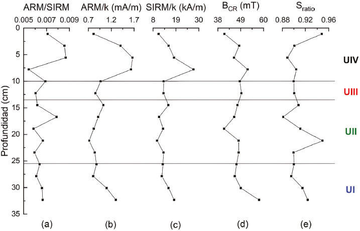 Los cocientes indicadores de las variaciones de tamaño de grano magnético, ARM/SIRM, ARM/k y SIRM/k (Figura 5a-5c), muestran una tendencia decreciente hacia el tope en UI, y un comportamiento constante en UII y UIII, lo que indica un aumento del tamaño de grano magnético desde la base del testigo hasta los 25 cm, que luego se mantiene sin grandes variaciones hasta los 10 cm. En UIV se observa una notoria disminución en el tamaño de grano respecto a las unidades anteriores. Este comportamiento también se observa en el gráfico SIRM vs k (Figura 6a), donde además se evidencia una menor concentración magnética en UIV en comparación con las otras unidades, excepto en la muestra ubicada en el tope, que presenta un importante incremento (Figura 4).
