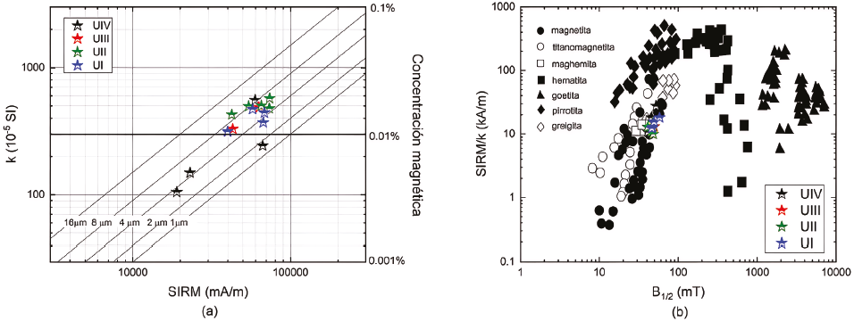 Figura 6 Biplots de a) SIRM vs. k (Thompson y Oldfield, 1986) y b) SIRM/k vs. B1/2 (Peters y Dekkers, 2003) como indicador de la mineralogía magnética.