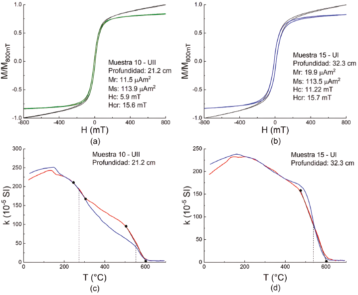 Las muestras 10 y 15 (Figura 7a, 7b respectivamente) son representativas del comportamiento de todas las muestras analizadas y presentan ciclos de histéresis simétricos (calculados tras la corrección dia y paramagnética), lo que apunta a que los conjuntos de partículas son de dominio pseudo-simple (DPS, por sus siglas en inglés) ya que muestran valores similares cerca del origen (Dunlop, 2002).