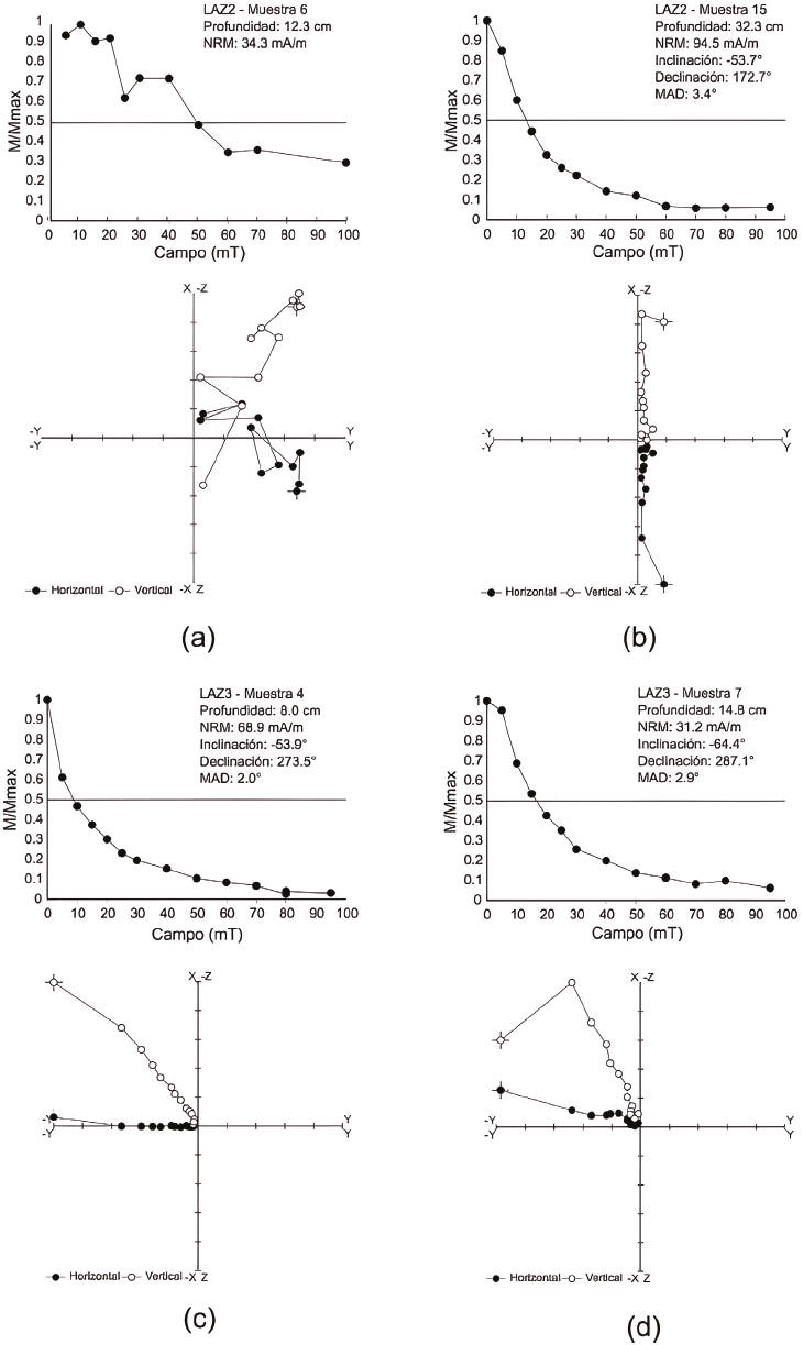Dado que los testigos no estaban orientados con respecto al norte magnético, los valores de declinación se centraron en torno a 0°, después de haber restado la declinación media de todo el testigo en cada caso. Las inclinaciones varían entre -60.8° y -41.6° para las muestras de UI de LAZ2 y -64.4° y -26.3° para LAZ3. Los registros muestran variaciones en torno a la inclinación esperada, según el modelo del dipolo geocéntrico axial (GAD, por sus siglas en inglés) en el sitio de estudio, que es de -60.1° (McElhinny y McFadden, 1999) lo que sugiere el potencial del sitio para realizar estudios paleomagnéticos.