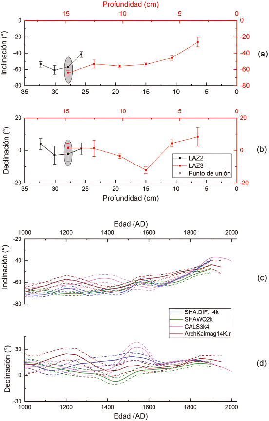 En la Figura 9c y 9d, se incluyen los registros de inclinación y declinación de los modelos geomagnéticos globales ArchKalmag14K.r (Schanner et al., 2022), CALS.3k4 (Korte et al., 2009), SHA.DIF.14k (Pavón-Carrasco et al., 2014), y SHAWQ2k (Campuzano et al., 2019) calculados para el último milenio en el sitio de estudio. Las variaciones de inclinación del registro LAZ3 muestran una tendencia general similar con los modelos pero es más difícil realizar una comparación del registro de declinación ya que los modelos presentan diferencias entre sí.