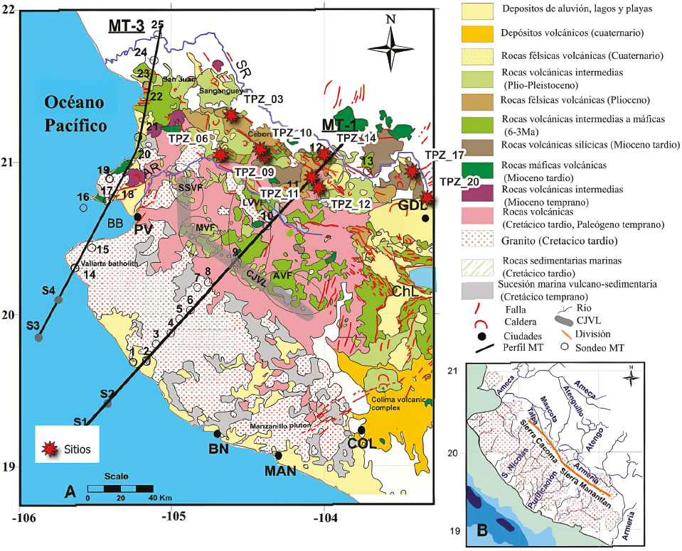 Figura 1 Mapa geológico de la región del Bloque Jalisco, modificado de Corbo-Camargo et al., 2013. En rojo se muestran los sitios de estudio.