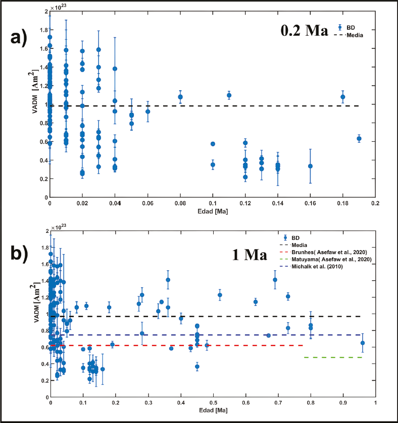 Figura 10 Variación de VADM de México para los doscientos mil años y el último millón de años. a) la línea punteada indica el valor medio del VADM para los últimos doscientos mil años de valores disponibles en la base de datos (BD); b) variación del VADM para el cron de Brunhes, reportados por Asefaw et al. (2020) y Michalk et al. (2010), en rojo y azul respectivamente, en verde se muestra el valor reportado por Asefaw et al., (2020) para el cron de Matuyama.