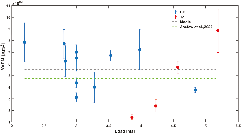 Figura 11 Variación del VADM de México para los 2 Ma a 5 Ma. BD son los datos de paleointensidades reportados hasta el momento. TZ son los datos de paleointensidades reportados en este estudio. La línea punteada verde, es el valor medio del VADM reportado para los últimos 5 Ma por Asefaw et al. (2020), mientras que la línea punteada en negro es el valor medio del VADM para los datos de paleointensidades en México.