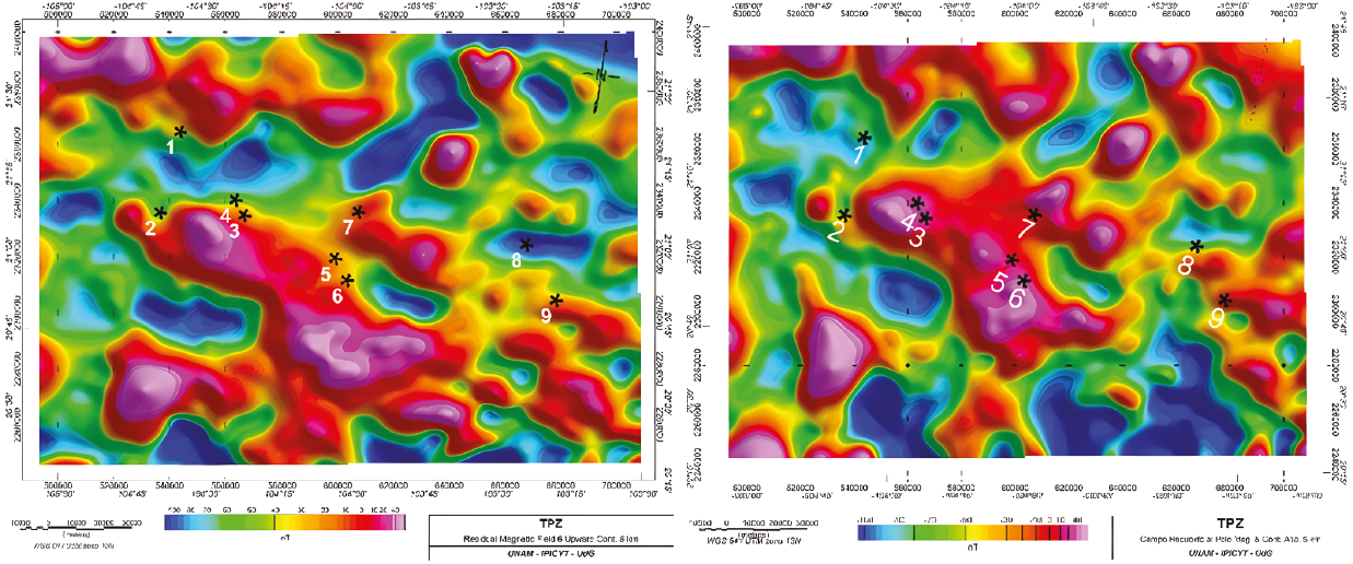 Figura 2 Mapas de contorno de A) Campo Magnético Residual y B) Campo Magnético Reducido al Polo. Los (*) numerados indican los sitios muestreados para este trabajo según se presentan en la Tabla l.