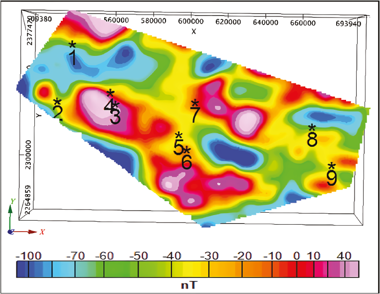 Figura 3 Polígono que muestra el área de estudio modelada 3D. Se observa también la configuración de isovalores del Campo Magnético Residual y los símbolos (*) indican la localización de los sitios estudiados paleomagneticamente según se indica en la Tabla l. En el sistema coordenado que se presenta en la esquina inferior izquierda se indica en color verde representa el vector (Y) la ubicación del norte y en color rojo la del E.l.