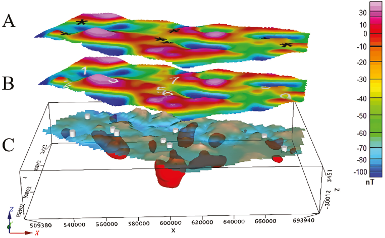 Figura 4 Modelo de inversión VOXI 3D de la susceptibilidad magnética. A y B son los mapas de contorno predichos y medidos respectivamente; C muestra el modelo de elevación digital. Los cilindros blancos numerados representan la ubicación de los sitios de estudio y los cuerpos en color rojo representan los cuerpos intrusivos con una susceptibilidad magnética de 0.005 SI. La flecha de color rojo en el extremo inferior izquierdo señala al Este y la de color verde señala al Norte geográfico. Z representa altitudes sobre y bajo el nivel del mar en metros.