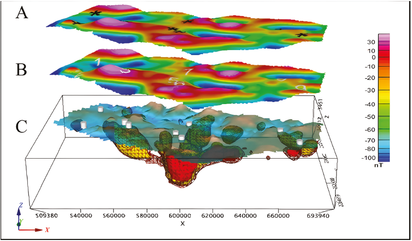 Figura 5 Modelo 3D VOXI. A y B son los mapas de contorno predichos y medidos respectivamente; C muestra el modelo de elevación digital. En el panel C, la roca que rodea al cuerpo intrusivo se muestra en color amarillo con un valor de k = 0.0025 SI, y la roca contorno predichos y medidos respectivamente; C muestra el modelo de elevación digital, los cilindros blancos representan la ubicación de los sitios de estudio y los cuerpos en rojo representan a rocas intrusivas con un valor de susceptibilidad de k = 0.005 SI. La flecha de color rojo en el extremo inferior izquierdo señala al Este y la de color verde señala al Norte geográfico.