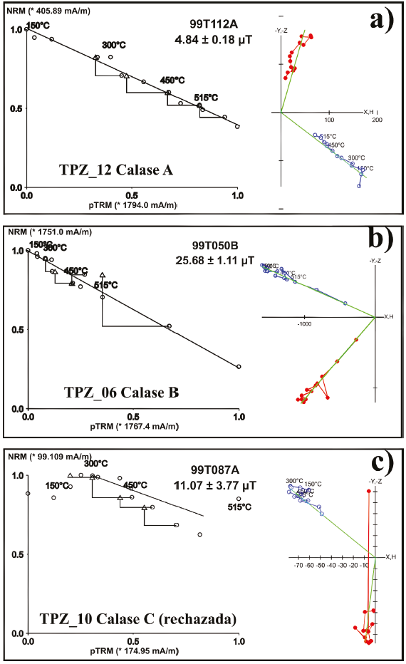 En el caso del sitio TPZ_12 se determinaron seis paleointensidades individuales, dos de clase A, una clase B y tres de clase C, es notable que en los seis casos se tienen valores de desviación estándar bajos, obteniéndose un valor de 6.4μT (d.s. 1). Para el sitio TPZ_17 se obtuvieron una paleointensidad clase B y cuatro de clase C, una determinación arrojó un valor excepcionalmente elevado de paleointensidad (70.4μT) y desviación estándar (10.8 μT), por lo que fue considerado un dato anómalo con respecto a la muestra y descartado para el cálculo de promedio siendo de 40.3T (d.s. 8.5). La Figura 6 muestra los diagramas de Arai representativos.