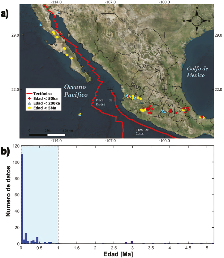 Geográficamente estos datos se distribuyen en todo el territorio de México, entre las latitudes 18° hasta 30° (Figura 7a), y temporalmente en los últimos 5 Ma. La mayor concentración de los datos ocurre para los últimos tres milenios, seguido de un grupo de datos dentro del último millón de años, se observa una escasez de datos entre 1 a 2 Ma (Figura 7b).