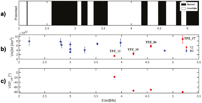 Los sitios estudiados dentro del presente trabajo cuentan con una dirección paleomagnética asociada, la cual fue determinada en el estudio Cervantes-Solano et al. (2020), ver Tabla 2. El sitio TPZ_12 posee una edad radiométrica asociada de 3.86 ± 0.04 Ma y una paleointensidad de 6.4 ±1.0 μT al mismo tiempo su paleodirección es de: Dec: 244.4 °, Inc: 27 °, α95 = 8.2 °, y un VGP PLat: -17.7 °[N], PLon: 189.4 °[E]. El sitio presenta una dirección intermedia y su paleointensidad presenta un valor por debajo de lo esperado, lo cual permite especular su relación con el evento de excursión geomagnética post Cochiti (e.g.Goguitchaichvili et al., 2009), incluso si el promedio de la intensidad se realiza de manera más estricta, utilizando los especímenes con mejores parámetros de calidad la intensidad continua siendo la misma de 6.6 ± 1.5 μT, lo que ratifica una intensidad baja para la zona y la edad en cuestión. El sitio TPZ_09 tiene una edad radiométrica de 4.01 ± 0.02 Ma, con una paleointensidad de 39.3 μT, determinada a partir de un solo espécimen, su dirección paleomagnética es de Dec:160.8 °, Inc: -5.2°, α95 = 7.4 °, y un VGP PLat: -63.8 °[N], PLon: 303.6 °[E], este valor de intensidad se encuentra dentro de los valores esperados para la zona sin embargo, al provenir de un único espécimen, debe considerarse con cautela. El sitio TPZ_10 tiene una edad radiométrica de 4.23 ± 0.02Ma y una paleodirección de: Dec:164.1 °, Inc: -34.7°, α95 = 5.5°, y PLat: -74.9°[N] PLon: 340.8 °[E] con una paleointensidad de 10.9 ± 2.4 μT, nuevamente este valor se mantiene dentro de la tendencia de valores bajos y concuerda con las intensidades obtenidas en los estudios de Mahgoub et al. (2021).