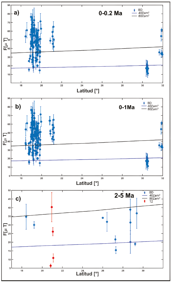 Figura 9 a) Variación de la intensidad en México en función de la latitud para los primeros doscientos mil años, b) el último millón de años y c) de 2 a 5 millones de años, en color azul se muestran los datos disponibles para México y en color rojo los de este trabajo. La línea de color negro (Azul) es la intensidad esperada a una latitud dada con respecto al momento dipolar reportada en el artículo de Asefaw et al. (2020).