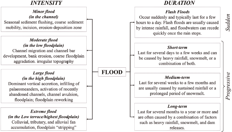 The reconstruction of past events allows the flood-prone areas to be identified (Garrote et al., 2018). Floods can be sudden, as the result of intense rains in a short period of time, or progressive, lasting for several days or weeks when the riverbed cannot sustain the volume of water produced (Merz and Blöschl, 2003). In addition to the geomorphological processes, the magnitude of floods can also be classified based on the area of the basin that the flood reaches (Benito and Hudson, 2010; Figure 1).