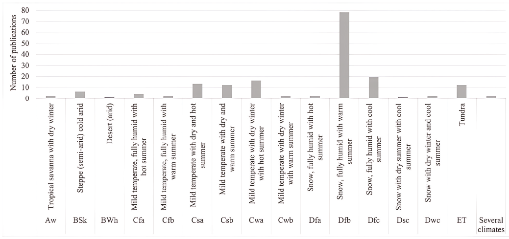 Figure 10 Type of climate according to Köppen's classification in which the studies were performed. "Several climates" refers to studies that were conducted in multiple regions or areas with distinct climatic conditions.