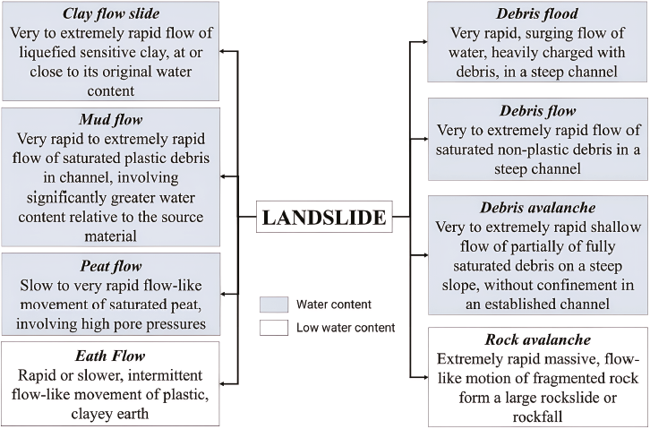 Landslides are natural geomorphic processes that modify the landscape and supply sediments to river channels; therefore, they are key in the dynamics of the Earth's surface (Ruiz-Villanueva et al., 2011; Sidle and Bogaard, 2016). According to Hungr et al., (2001), landslide phenomena can be usefully divided into the following classes: the flow type based on the material type, water content, presence of excess pore pressure or liquefaction at the source of the landslide, presence of a defined recurrent path (channel) and deposition area (fan), as well as velocity and peak discharge of the event. The classification based on the water content involved in the process is a relevant choice for this research, as it focuses specifically on hydrogeomorphological hazards triggered by rainfall (Figure 2).