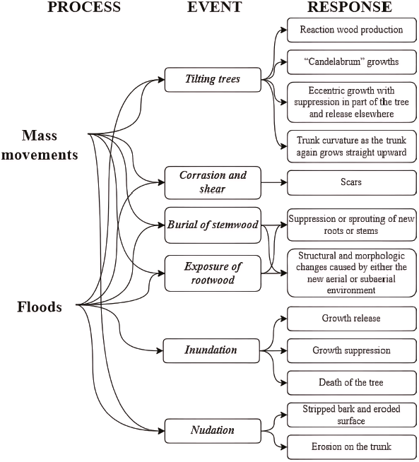 Dendrochronological techniques have been applied since the early second half of the 20th century (Sigafoos, 1964), but their application in the study of hazardous events in mountain areas mainly began in the 1980s. This led to an increase in the understanding of the links between geomorphic and hydrological processes in these environments (Sidle and Onda, 2004).