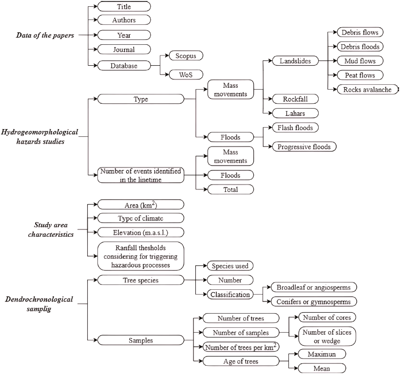 The papers resulting from the searches were limited to case studies and filtered by selecting only the articles that fit the objectives of this research. The articles yielded various pieces of information, including the following: the papers' data (title, authors, year, journal, location of the database); types and number of hazards studied; the country and continent where the study area is located; the number of events identified in the timeline; and the study area's characteristics, such as its size, climate, elevation and rainfall thresholds considered for triggering hazardous processes. Additionally, the details of dendrochronological sampling were noted, including the number of trees used, the number and type of species, the number of samples (in wedges, slices, or cores), and the maximum and average age of the trees (Figure 4).