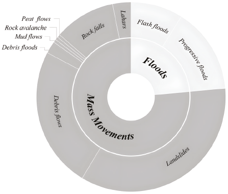 It is important to note that many authors use the terms mass movement and landslide interchangeably. For example, 69% of the articles reviewed were related to landslides, although not all authors used this term in accordance with the classifications considered in this study. The general term, landslide was used in 55.8% of the papers related to landslides, while 38.3% were related to debris flow, 3.3% to debris floods, while peat flows, rock avalanches, and mud flows each represented 0.8%. The articles related to rockfalls, and lahars accounted for 14.9% and 4.5%, respectively. In relation to floods, 62.2% of the articles reviewed focused on progressive floods, while 37.8% studied flash floods (Figure 5).