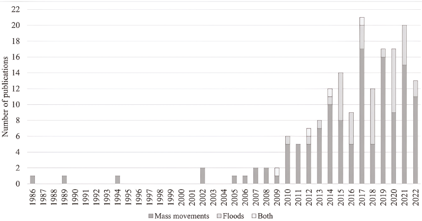 Figure 6 Number of publications per year related to the study of mass movements and flood hazards in mountain areas through the application of dendrochronology.
